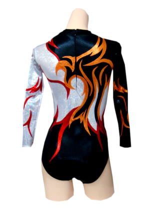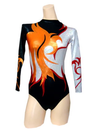 エアロビクスオーダーメイドレオタード OLYNSTONE WGR-A-101C レオタード ブラックメタリックをベースにオレンジ+レッドメタリックの模様が躍動感あふれる競技用レオタード衣装です。 ホワイトシルバーホログラムの輝きがとても美しいです。