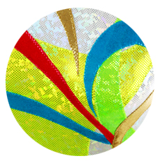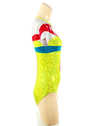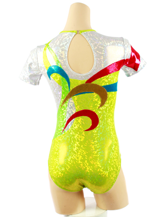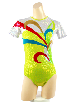 エアロビクスオーダーメイドレオタード OLYNSTONE WGR-A-1134NYho レオタード ネオンイエローと白のホログラムをベースにした華やかで美しい競技用レオタードです。 金、ライトブルー、チェリーピンクメタリックとネオングリーンホログラムの躍動感あふれる模様が レオタード全体をエネルギッシュな印象に演出しています。