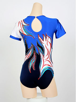 エアロビクスレオタード OLYNSTONE WGR-A-1608slcr レオタード 紺ベルベットと白ライクラ、青ライクラの組合せが シャープで美しい競技用レオタードです。 赤メタリックとターコイズメタリックの模様がデザインのアクセントになっています。 クリスタルとスパンコールが装飾されたゴージャスなデザインです。